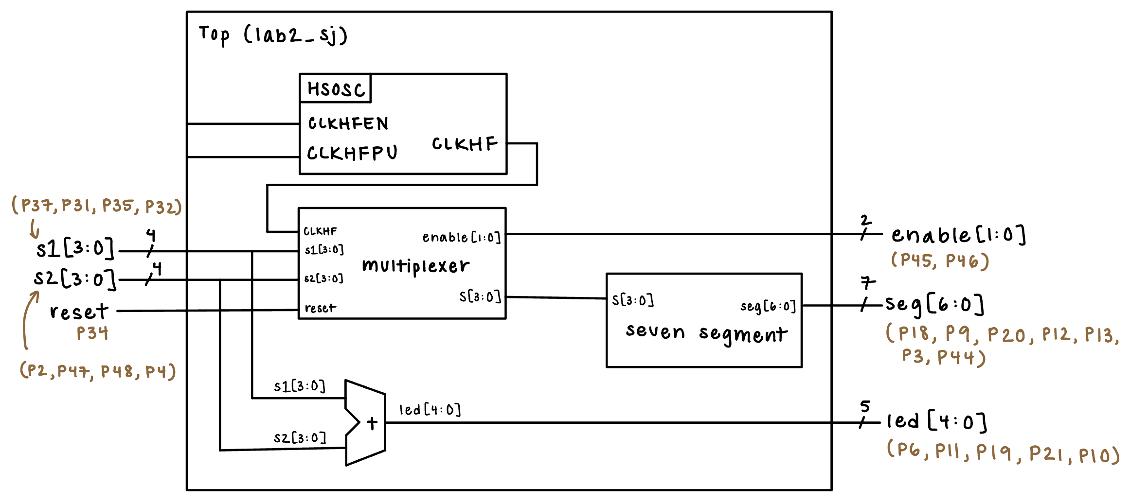 From a software standpoint, important decisions were made in order to split up the required tasks of the lab into respective modules. A top level module was used to instantiate the on-board high-speed oscillator (HSOSC) from the iCE40 UltraPlus primitive library, which was the 48 MHz clock that was divided and used throughout the system. The top level module also contained the combinational logic for the five individual LEDs, as they were simple and therefore did not require a separate module.