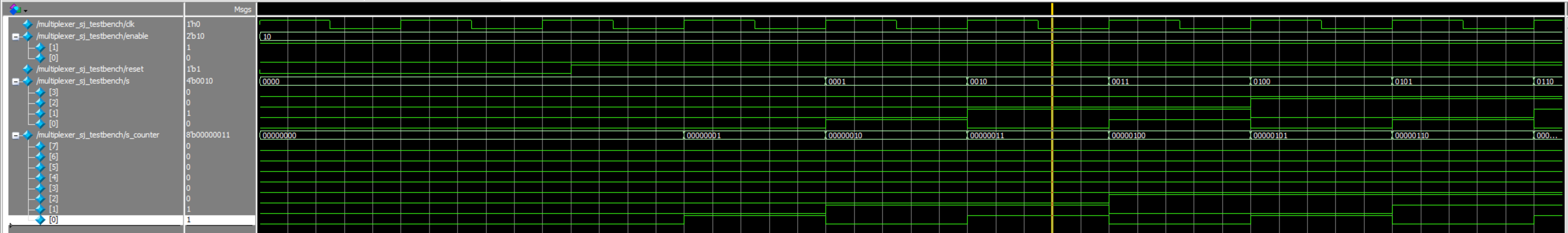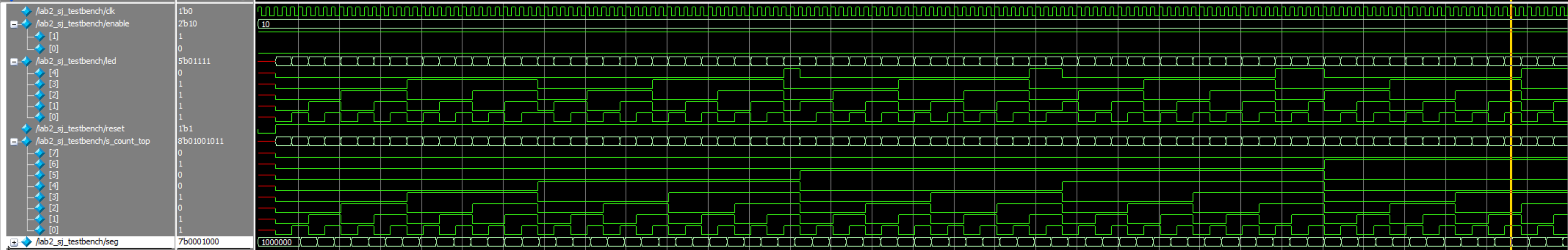 As shown in the simulation images below, all the simulations passed and produced the expected outputs. Figures 6 and 7 show the simulation waveforms for the top level module. Figure 6 shows that the led variable is the correct sum of the 8-bit counter input. Figure 7 shows that when zoomed out, the enable toggles and tests the other cases. Figure 8 shows that s (input to the seven-segment module) gets the correct four bit input during the correct enable. In the waveforms, it is visible that the value of four bits of s_counter (the input) match the value of s one clock cycle later. This makes sense because s is an output of the multiplexer module, and thus displays its value one clock cycle later. Similar to the top level, zooming out shows that the enable switches as expected to test all the other cases. Figure 10 shows the seven-segment waveforms also producing the expected outputs for the segment values on the display.
