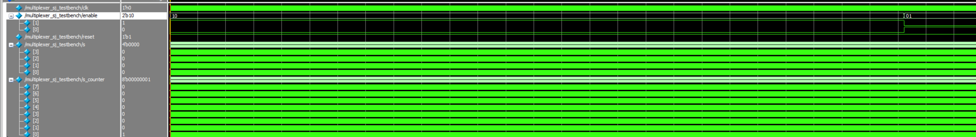 Three testbenches were written in SystemVerilog, one for each of the modules (top level, multiplexer, and seven-segment), in order to show that the combinational logic works and that the enables toggle and produce the correct, corresponding display.