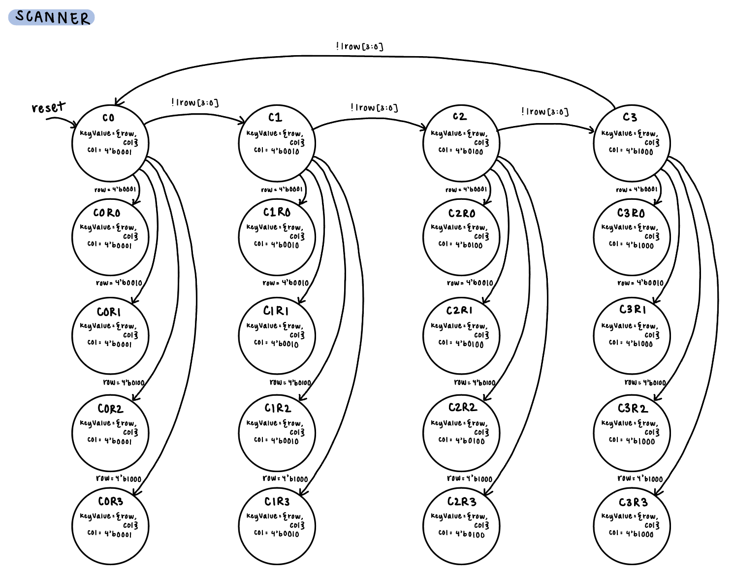 As shown in figure 1, the scanner FSM has one state for each column, and one for each row within each column. Given a row input, the FSM should transition from the column state to the state corresponding to the row input. If no rows are pressed, you transition to the next column and repeat the process. My FSM was originally simpler, but in order to account for edge cases in button pressing, I decided to make each row a distinct state.