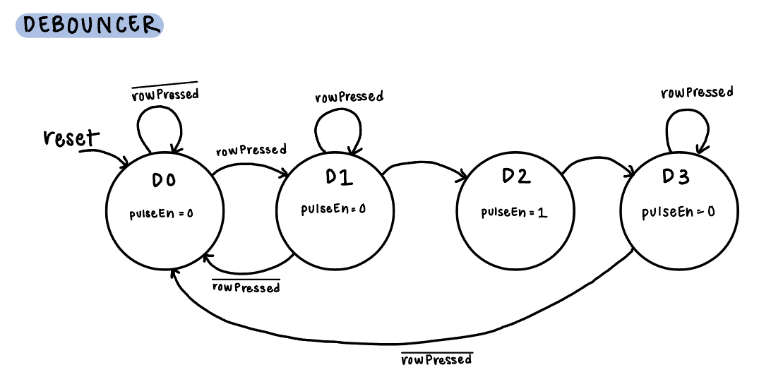 The next big design consideration was debouncer FSM. One important consideration when working with the keypad matrix is switch bouncing. When a button is pressed, the input may take some time to settle. In order to not register the “bouncing” as multiple presses, a method for switch debouncing has to be implemented. I did this using another FSM, which interacts with my scanner FSM and the rest of my modules.