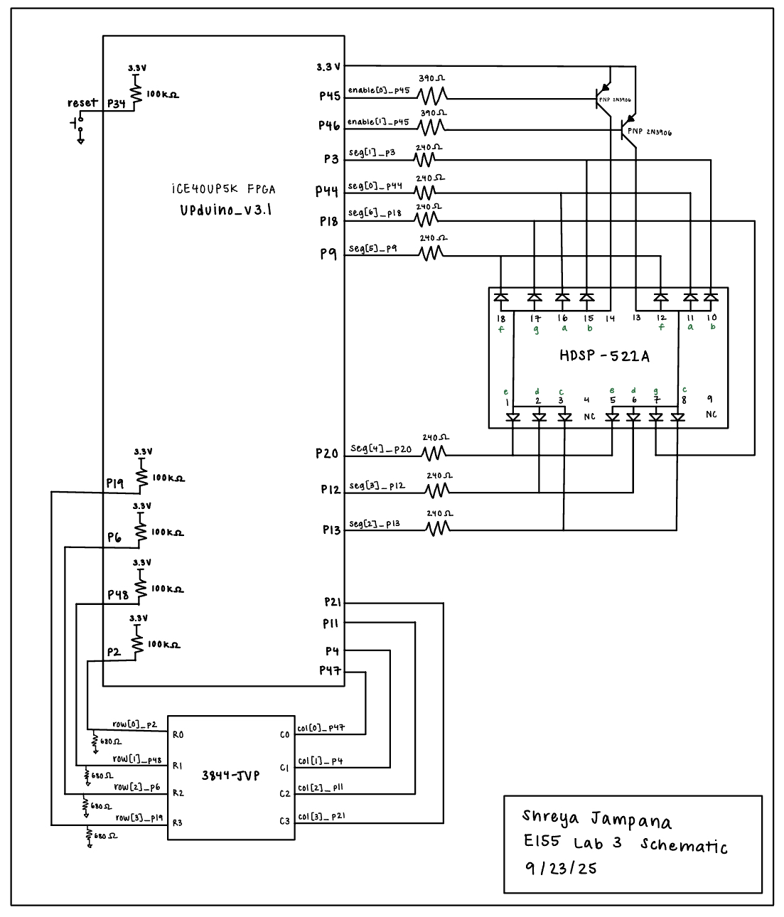 The schematic for the system is shown below in figure 5. It includes the FPGA, the dual seven segment, and the keypad.
