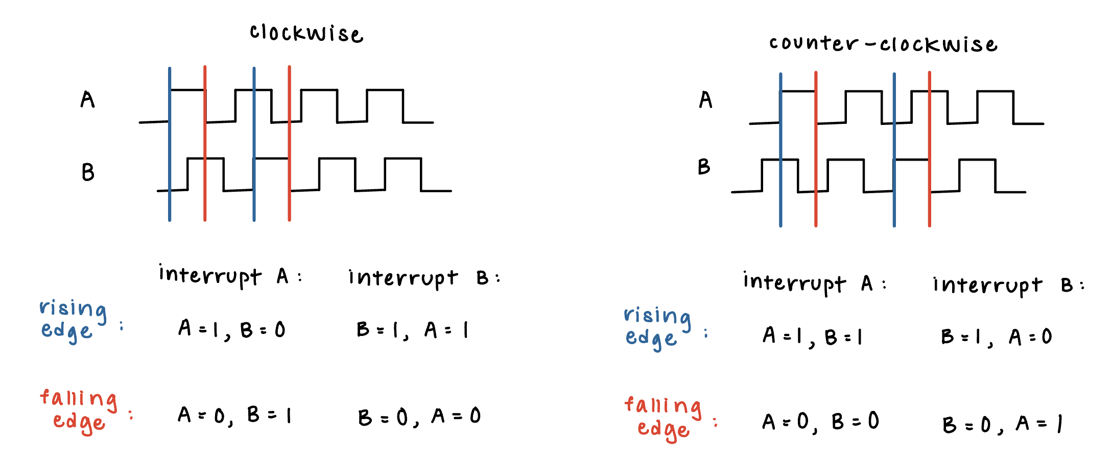 The interrupt design, described above, was the main portion of the software. Another important part was incorporating the counter into the interrupt and using that to calculate velocity. As mentioned above, each interrupt had four cases. In each case, if the motion was clockwise, the counter incremented. If the motion was counter-clockwise, the counter decreased. A graphical illustration of this using the signals from the encoder are shown below in Figure 4.