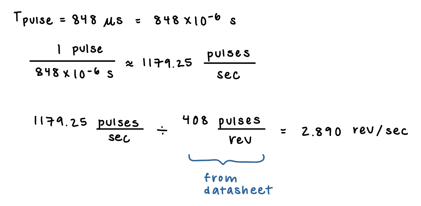 As shown on the oscilloscope screen, the output signal has a period of 848us. Calculations are shown below in Figure 6 to derive the speed of the motor using this value.