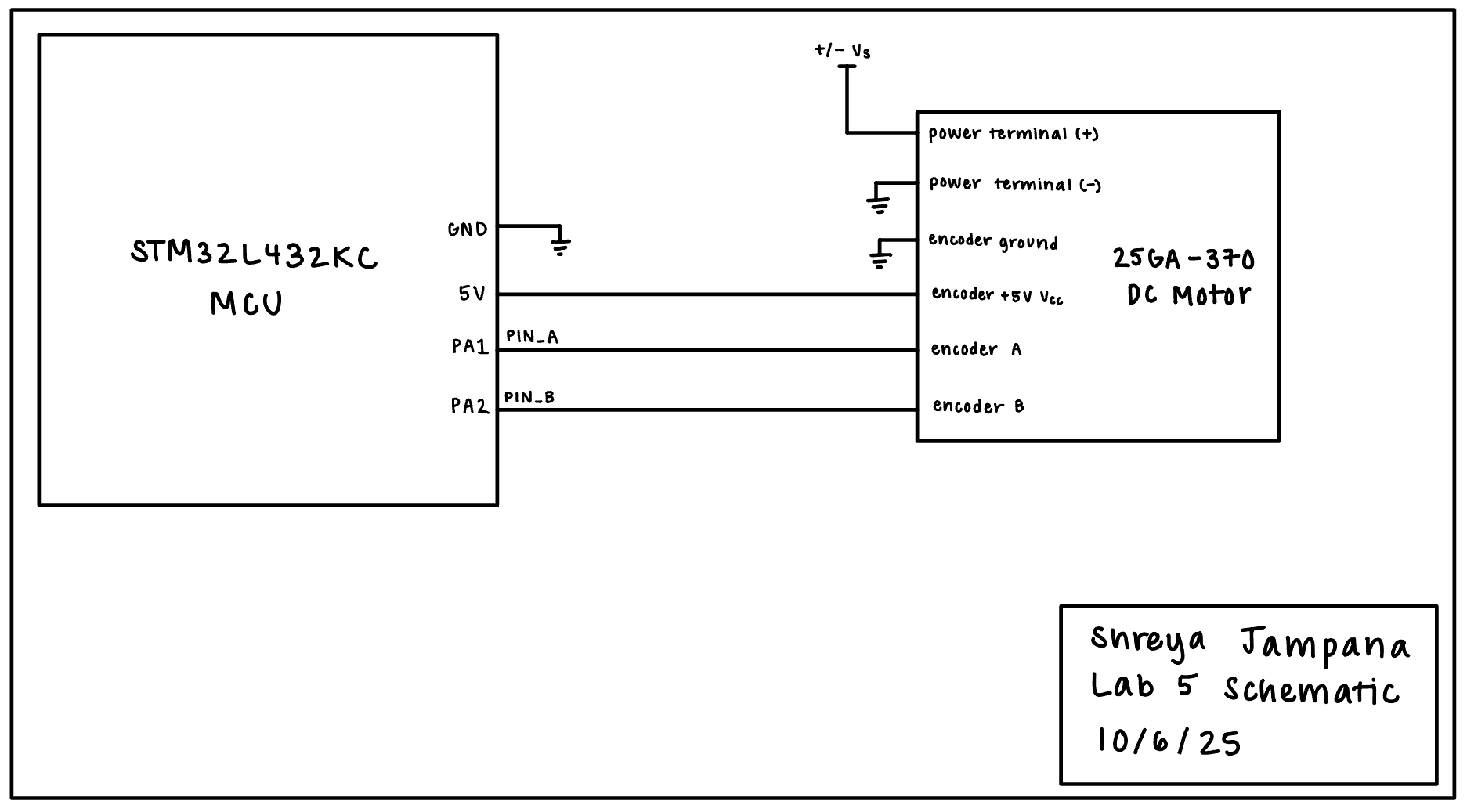 The circuit from this lab was very simple, as shown in the schematic below in Figure 8. It only consisted of connecting the motor encoder to the two MCU GPIO pins and a variable DC voltage +/- Vs being applied to the positive terminal of the motor from a power supply.