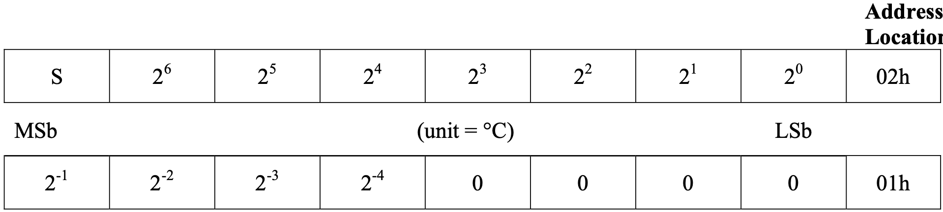 Using the information from table 2 below, a simple calculation was done to calculate the temperature value from the data received from the sensor. The raw data is divided by 256 in order to get the temperatyre out. This is because the DS1722 only uses 12 bits for temperature but sends 16 bits, meaning it shifts its data left by 4 bits (×2⁴) and fills the lowest 4 bits with zeros. When you read both bytes and combine them in code, you shift the MSB by another 8 bits (×2⁸). The unused 4 zeros cancel out part of that scaling, leaving the final number 2⁸ = 256 times larger than the real temperature. So ividing by 256 moves the binary point back, giving the correct temperature value.