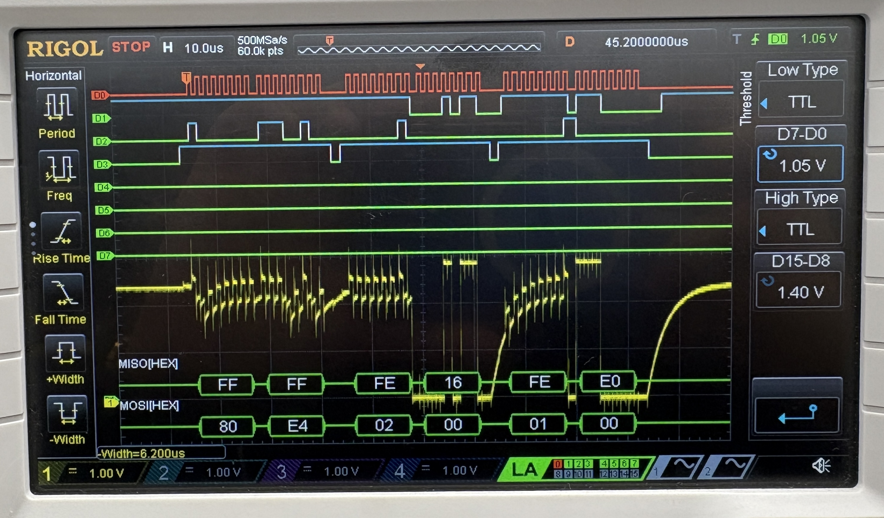 In order to test the SPI transactions, I checked them on a logic analyzer to ensure that the SCLK, CIPO, COPI, and the CE were all matching my expectations. A trace of a properly functioning SPI transaction is shown below in Figure 1.