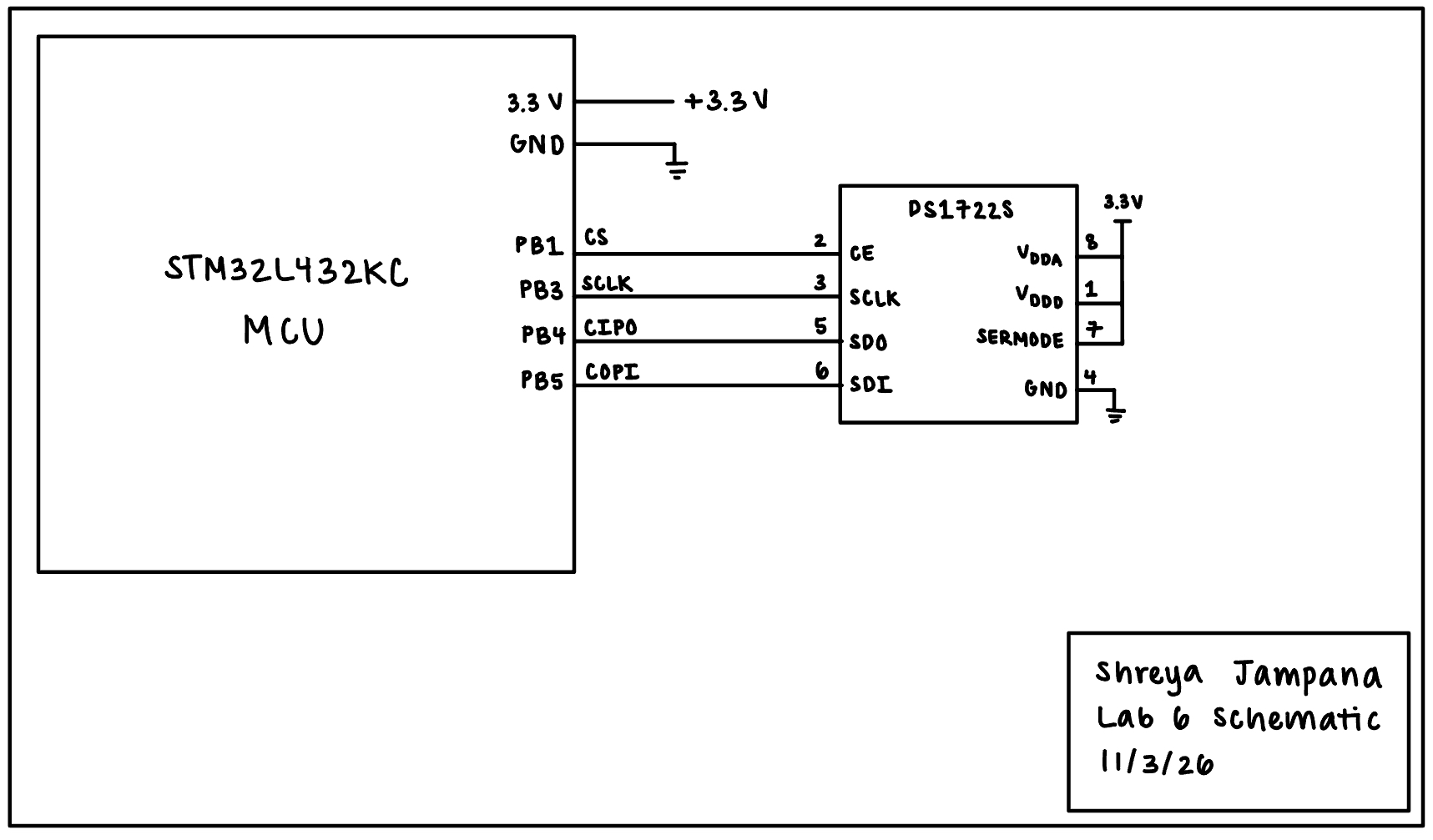 The temperature sensor we used for this lab is the DS1722 Digital Thermometer. It had both an SPI and a 3-Wire interface, but in this lab, we used SPI. I consulted the DS1722 datasheet to correctly wire up the device, which consisted of connecting the MCU pins to the sensor’s CLK, CE, SDI, and SDO, with the SERMODE being set to SPI.