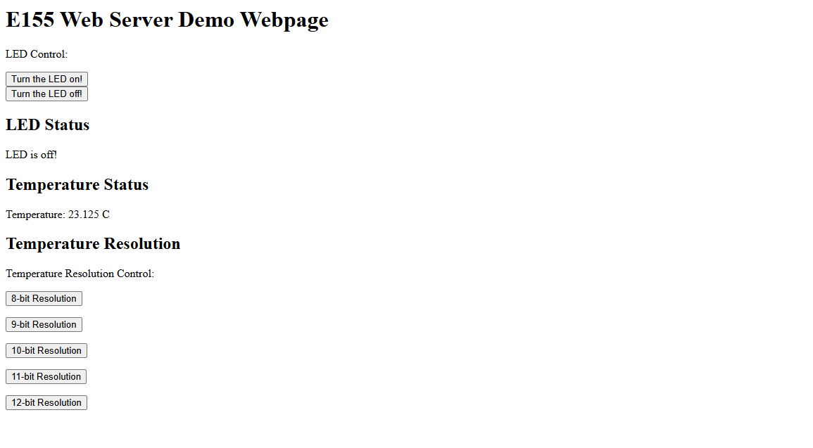 The design met all the intended objectives. The final result of the website is shown below in Figure 3. The button to blink the onboard LED on and off functions properly, and the temperature sensor also reads accurate ambient room temperature data and allows for user resolution input.